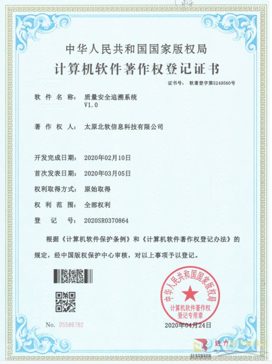 熱烈祝賀公司獲得《質(zhì)量安全追溯系統(tǒng)》軟件著作權(quán)!