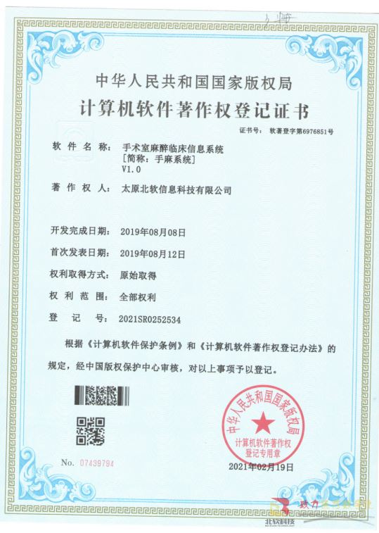 熱烈祝賀公司獲得《手術(shù)室麻醉臨床信息系統(tǒng)》軟件著作權(quán)!