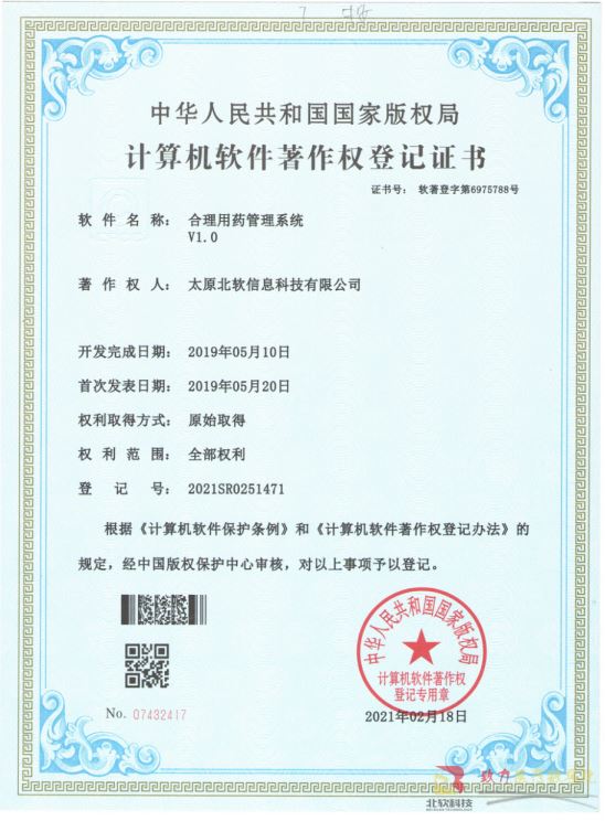 熱烈祝賀公司獲得《合理用藥管理系統(tǒng)》軟件著作權!