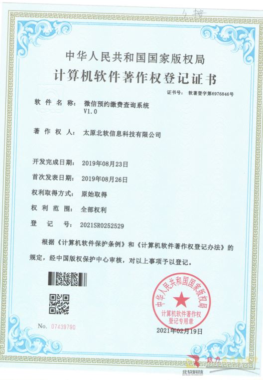 熱烈祝賀公司獲得《微信預(yù)約繳費查詢系統(tǒng)》軟件著作權(quán)!
