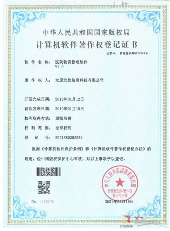 熱烈祝賀公司獲得《醫(yī)院物資管理軟件》軟件著作權(quán)!